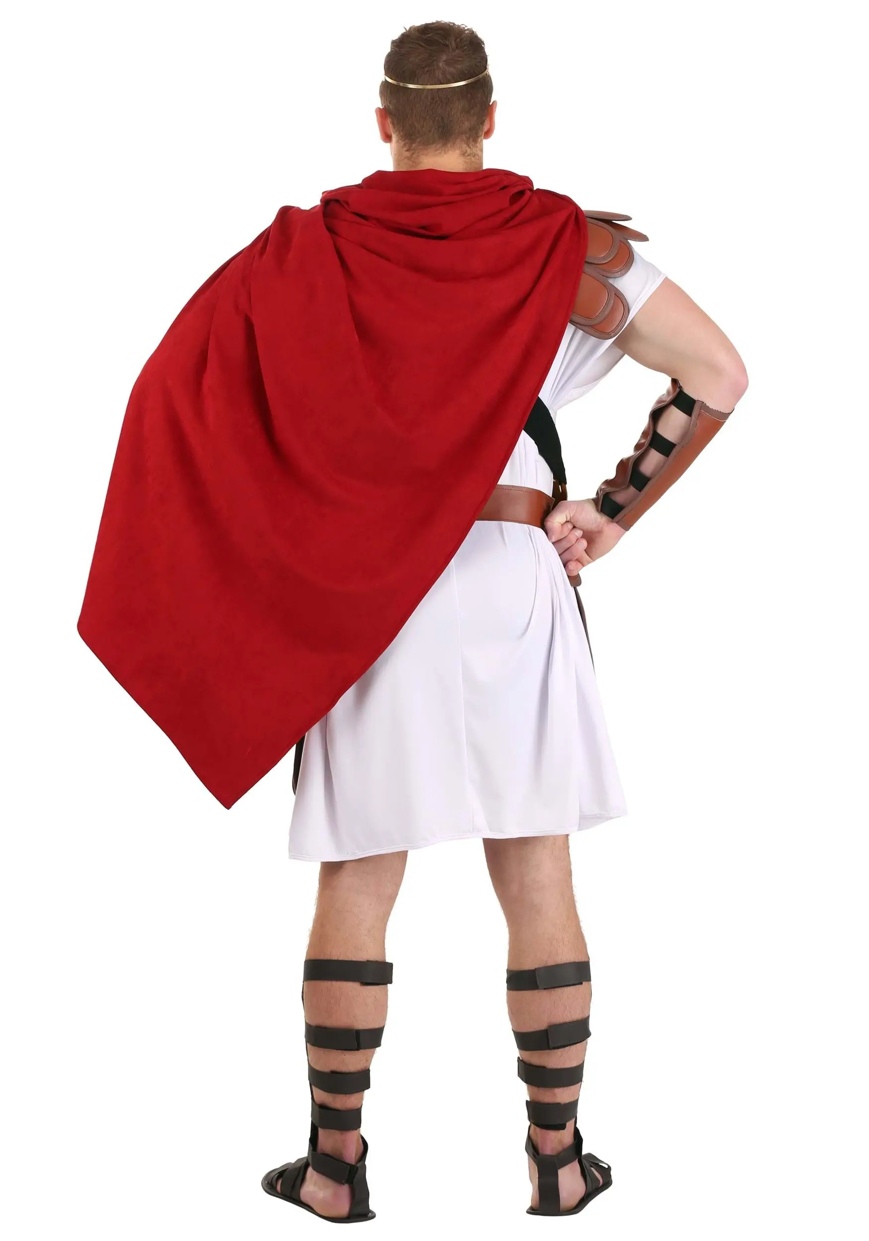 - COSTUME INCLUDES: This Imperial Caesar Costume Adult Outfit comes with a tunic with shoulder armor pieces, a metallic plastic chest piece, a red cape, a belt with armor flaps, a metal laurel wreath headband, and a pair of gauntlets.