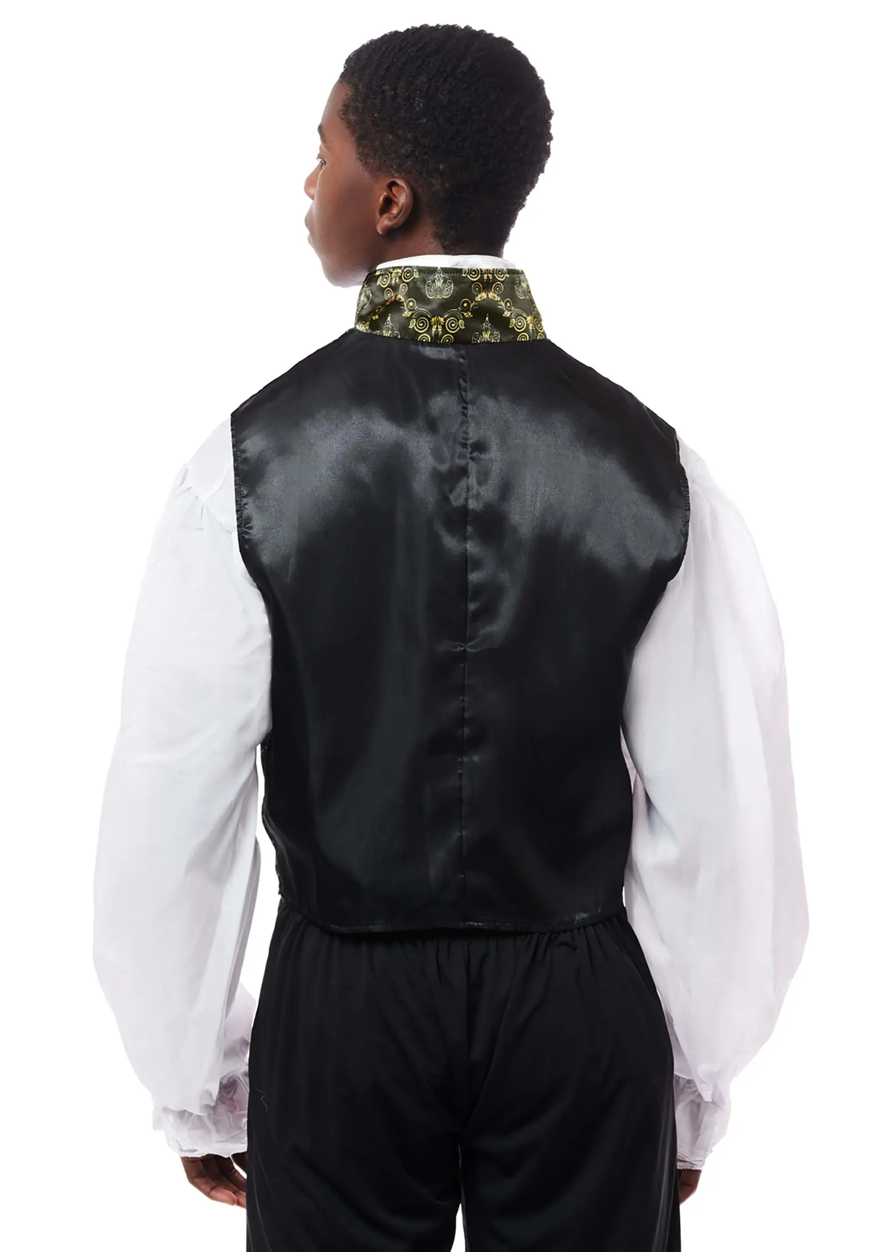 Impress society’s creme de la creme in this Regency Duke Vest and Dickey for Men! The set includes a black patterned vest that can be worn on top of a white shirt of your choice. A dickey embellished with a crisp white cravat fits down the vest front.