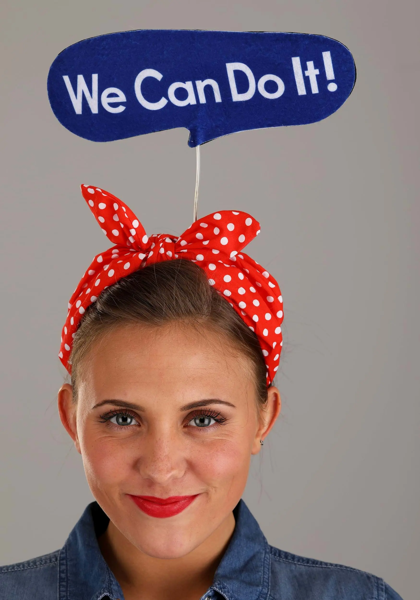 If you love celebrating confident women everywhere, this exclusive Rosie the Riveter Costume Kit is for you! You’ll look just like the queen from the iconic 1940s posters in the knotted red bandanna-style headband with its white polka dots. A blue speech bubble reading “We Can Do It!” waves proudly from a wire attached to the headband’s center. Also included are a red and white “Rosie” name take and a silvery button with a graphic logo.
