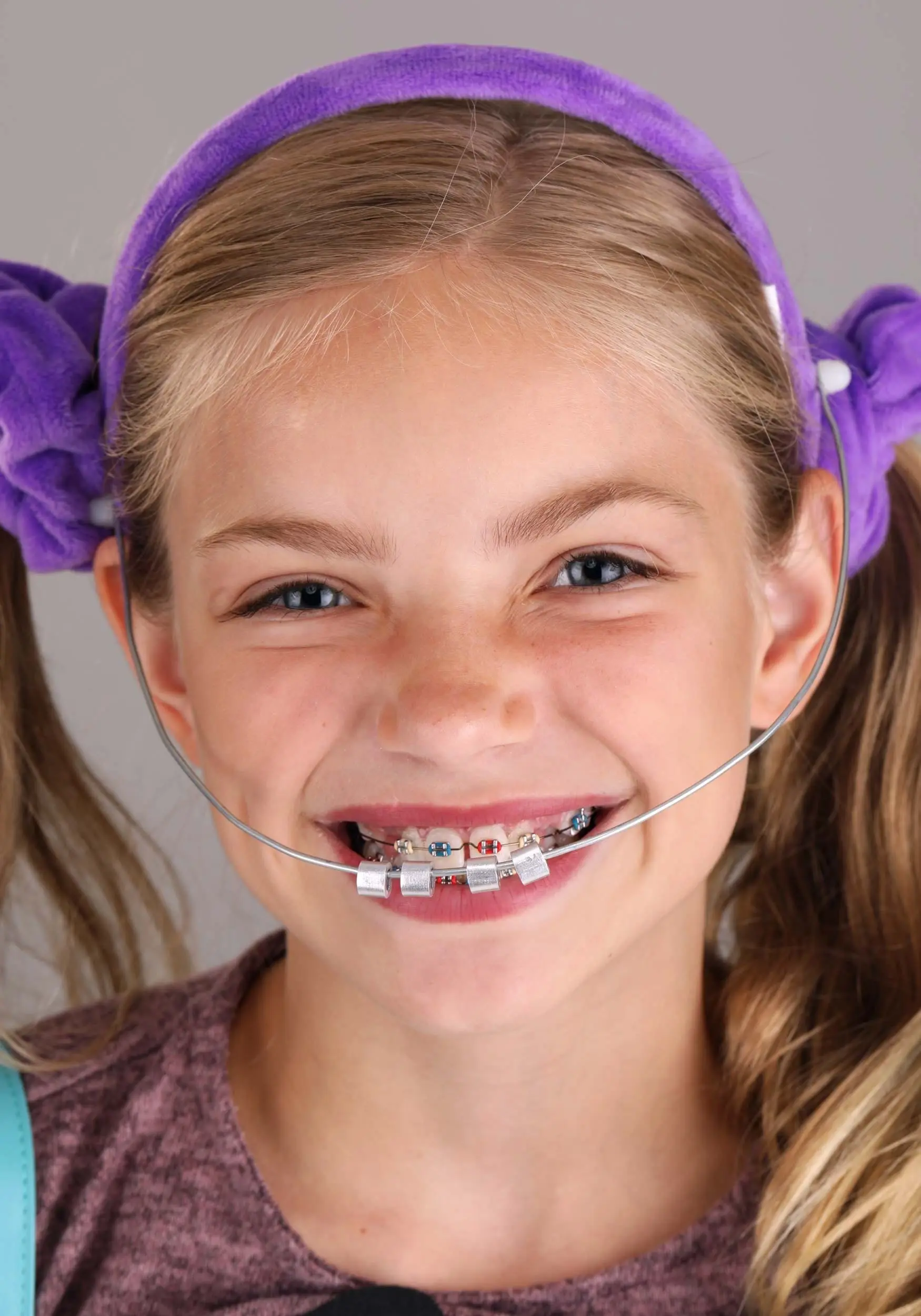 - Headgear is velour-covered plastic headband w/ swiveling wire meant to look like a facebow