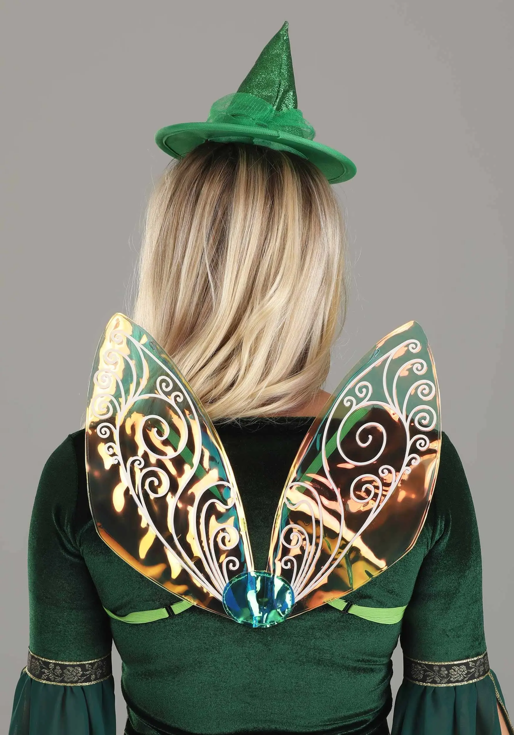 This officially licensed, exclusive Disney Fauna the Fairy Headband & Wings Kit is so pretty that it’s practically magical! A pointed hat with a sparkly crown and a wide green tulle band is attached to a cloth-covered headband so that the hat appears to float on top of your head. The gorgeous vinyl wings feature a lovely design of swirly green and gold, as well as a jewel-like green center, and loop over your shoulders via elastic straps.
