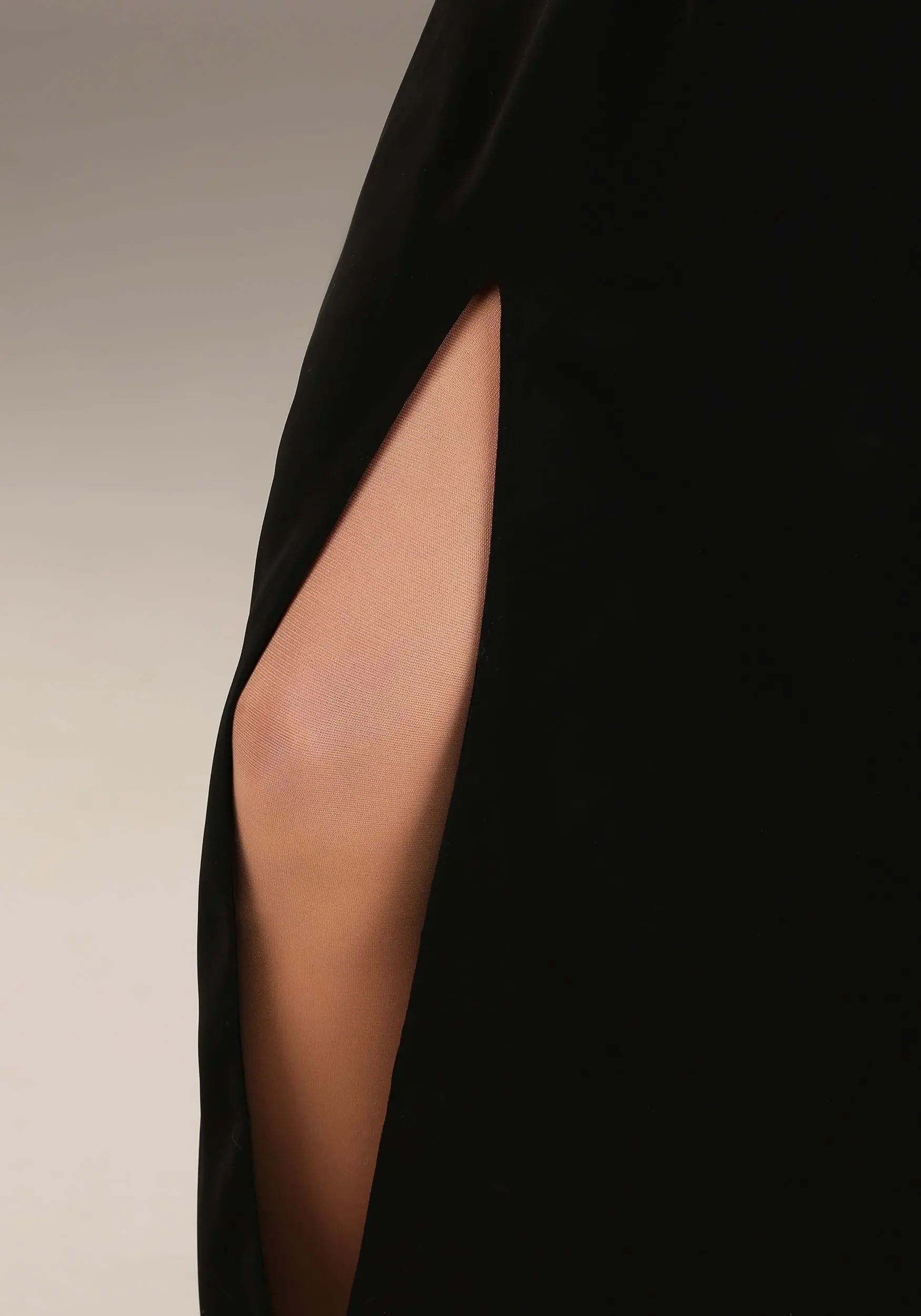 - Pullover black jersey knit dress w/ long slit