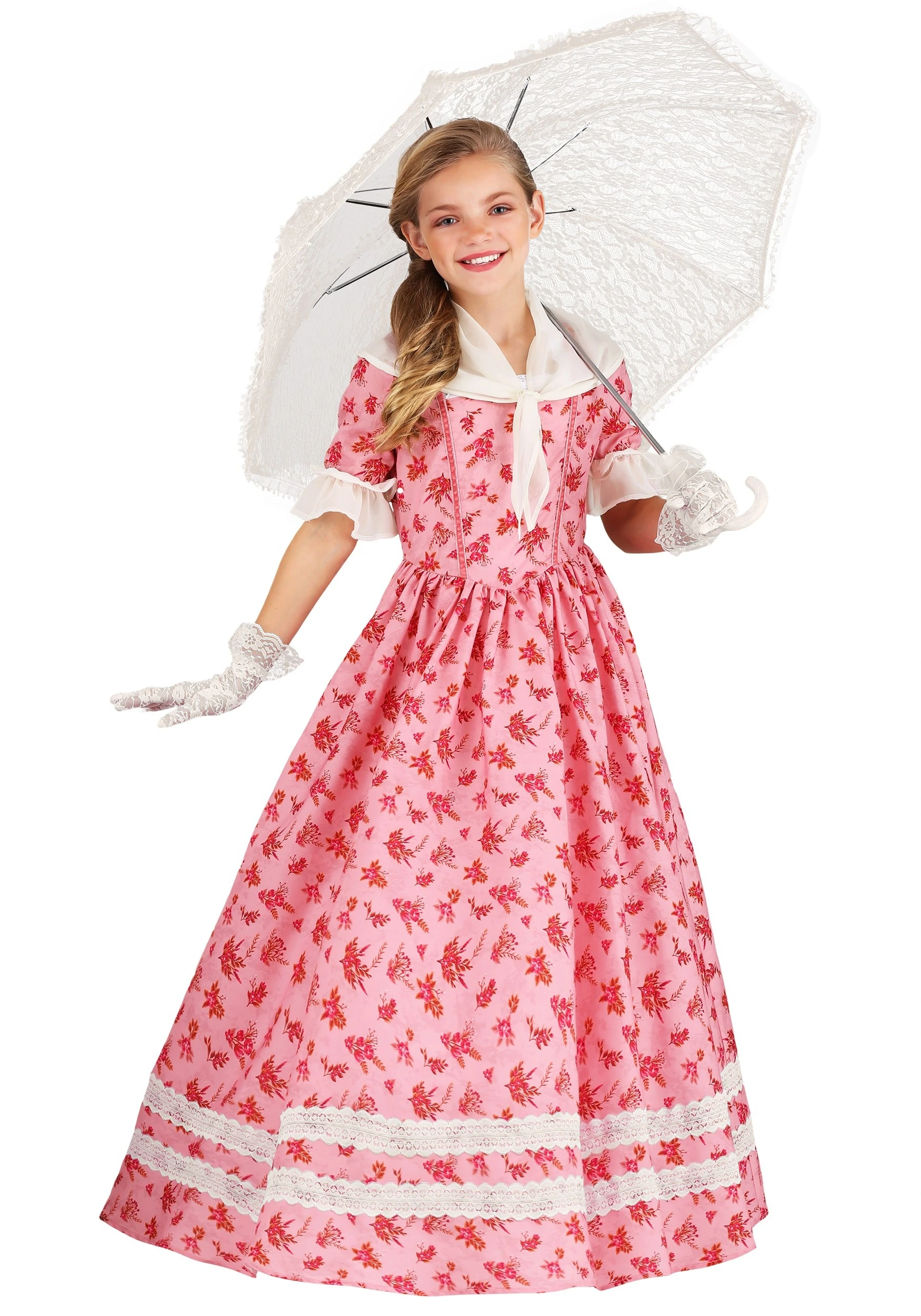 Thankfully, your charming southern belle doesn’t have to worry about trading comfort for style at her next ball with this beautiful Kid’s Lovely Southern Belle Costume. (It’s all there in the name!) This exclusive costume features dark pink flowers in an all over print on a lighter pink background. The dress is 100 percent polyester calico and chiffon fabrics, with a back zipper for easy wear. It features fashionable puffed sleeves with ruffled chiffon cuffs, eyelet edging at the square neckline, and white lace strips on the skirt. There’s also a triangular chiffon scarf that can be tied as desired. (Note: The gloves and parasol shown in the photo are each sold separately.)