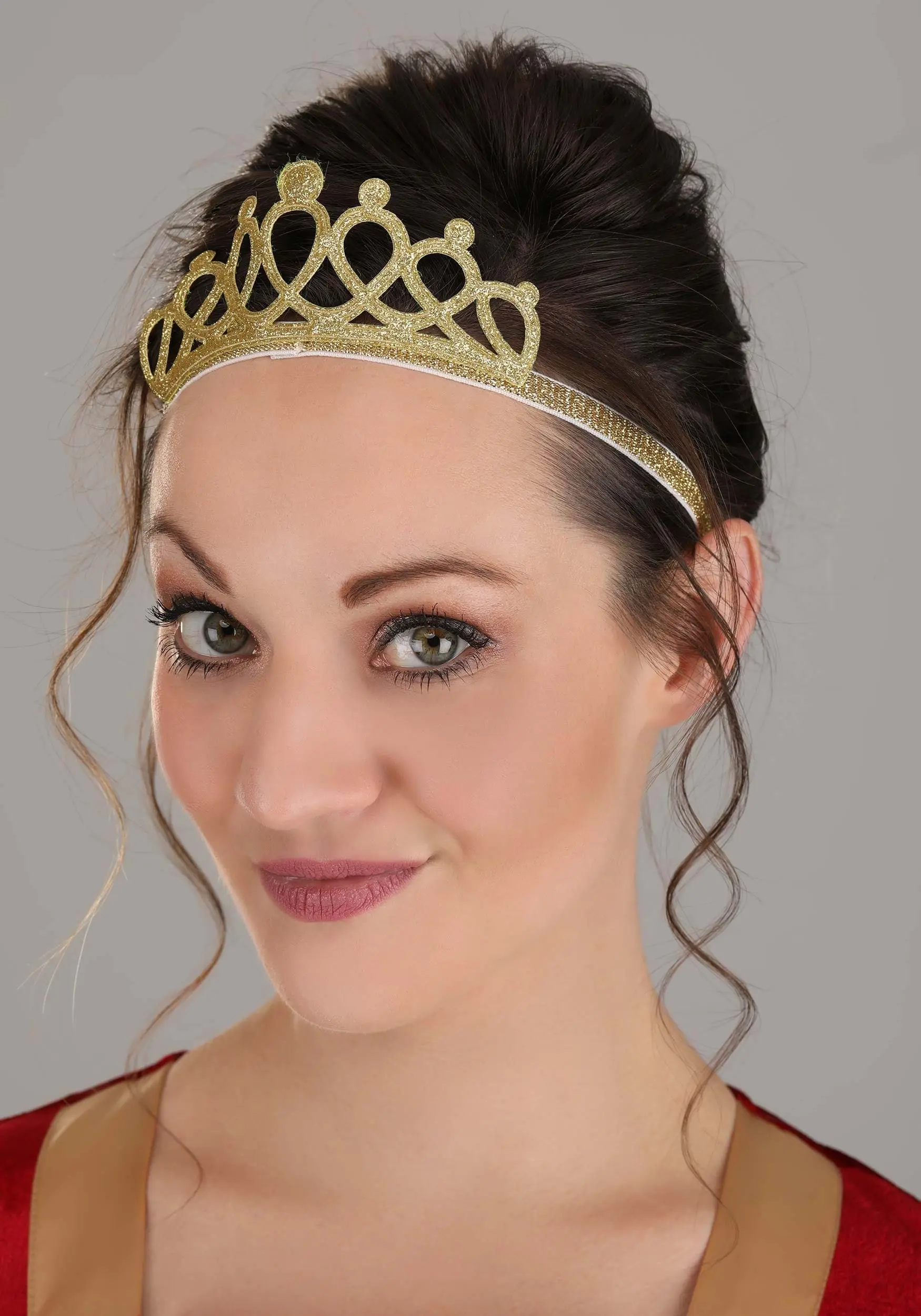 Be the subject of many a lovesick bard’s ballads when you wear this gorgeous, exclusive Women’s Renaissance Maiden Costume! The sweeping gown is made of cranberry-hued velvet with sleeves that are tight to the elbow before fanning out into exaggerated bells trimmed with gold satin ribbon. The gold ribbon is echoed on the bodice, framing the red broacade inset, and separates the larger brocade inset on the skirt from the velvet overdress. The included crown has an elastic band on the back to ensure a snug fit.
