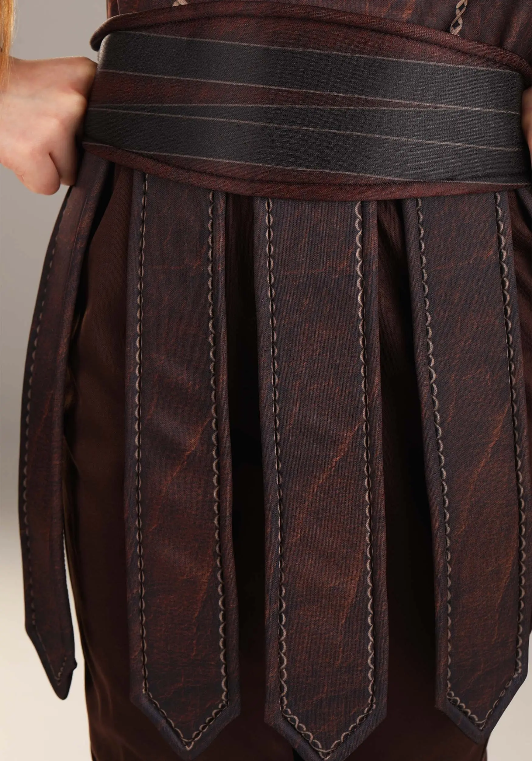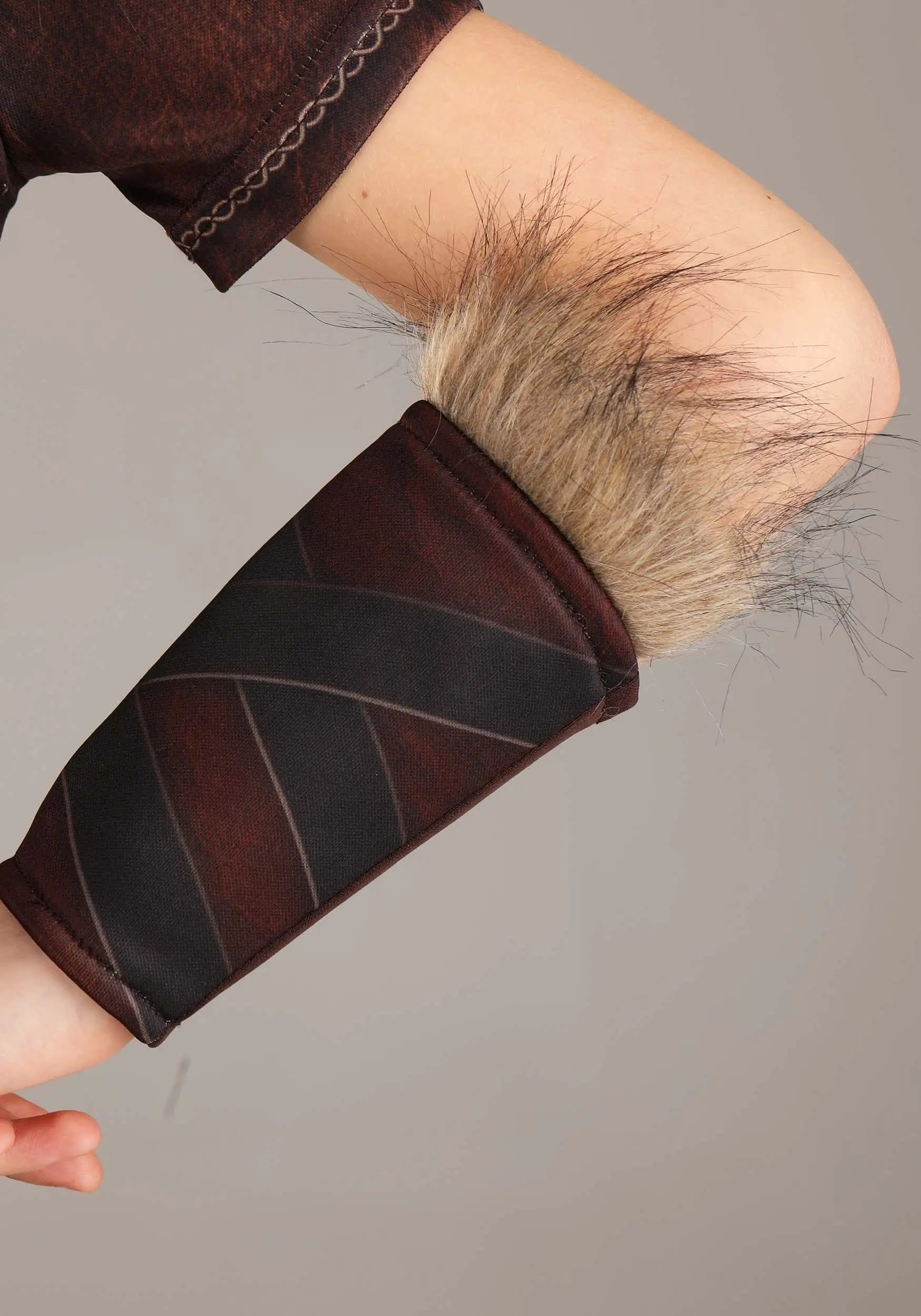 The tunic has an aged leather background and is printed with a Celtic knot and nordic patterns. A battle-ready belt secures around the waist with a hook and loop strip at the back. Complete with a collar decorated in fabric medallions and a pair of gauntlets, this kid’s Viking costume is going to be a favorite costume to play pretend in long after Halloween is over!