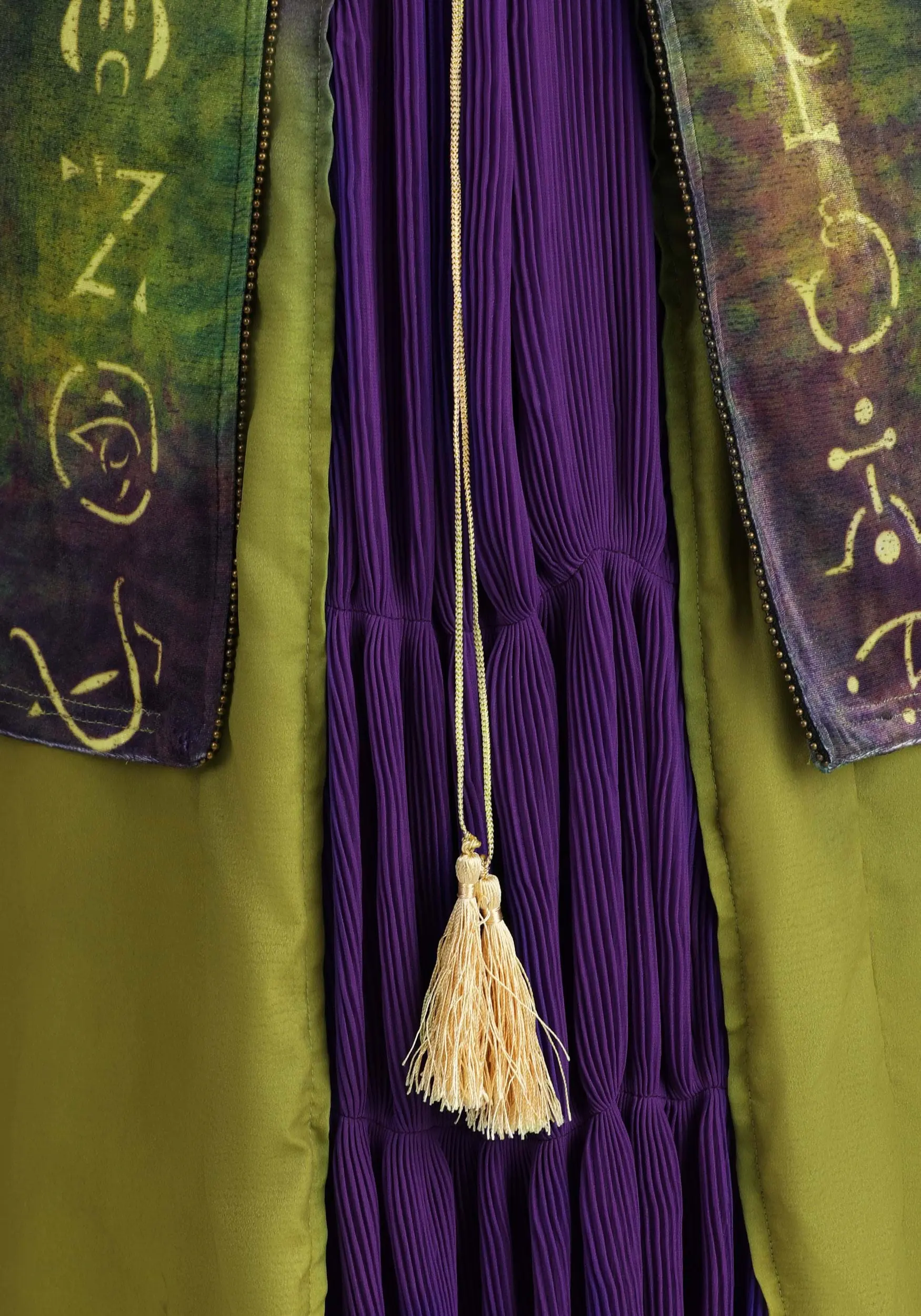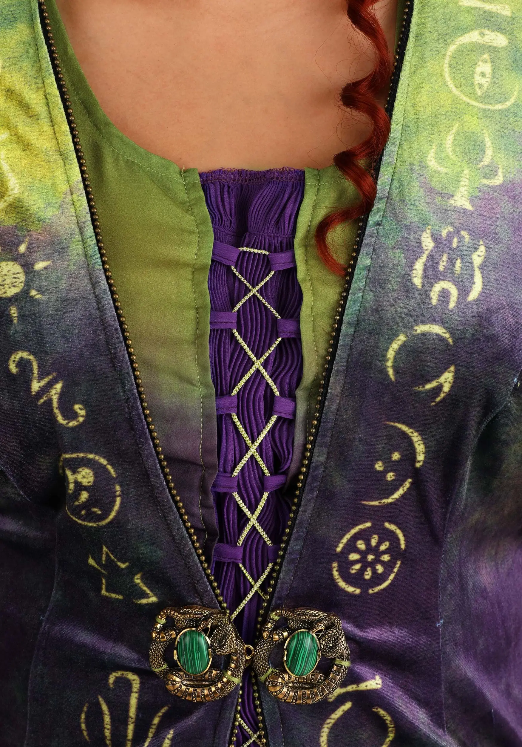 If it turns out that finding a real spell book is harder than it seemed, we have another way to help you feel just as magical. Give a twirl and transform into Disney’s Hocus Pocus witch when you wear this officially licensed Winifred Sanderson costume. Our in-house design team cast their incantations for weeks to bring the classic Hocus Pocus look to life. Your ensemble begins with a dress that features multiple layers of fabric from the crinkliest purple to its magical overlays. Golden dress cords accent your look while you don Winifred’s coat, featuring long, draping sleeves and bronze jacket clasp. Complete your transformation with our Winifred wig so you can master her superior style. All you’ll need to support is the powerful personality! Team up with a couple of your own sisters to complete the Sanderson coven for the greatest Hocus Pocus group costume of the season!