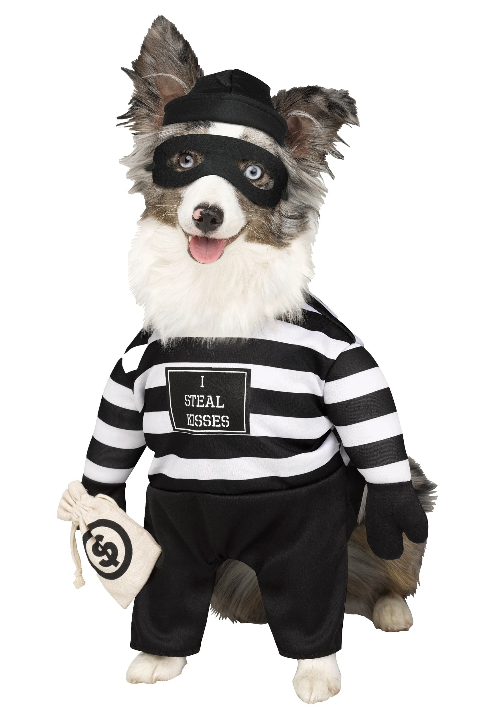 This Robber Pup Pet Costume is a classic look that comes with a jumpsuit that fits over your dog’s front paws. The front of the costume is designed to look like a striped prisoner jumpsuit for that classic robber look. It also comes with a pair of attached arms on the sides, along with a sign in front that reads “I Steal Kisses.” Finally, it comes with a mask that tops the whole look off! When you pooch has it all on, he’ll look like the true burger bandit that they are!