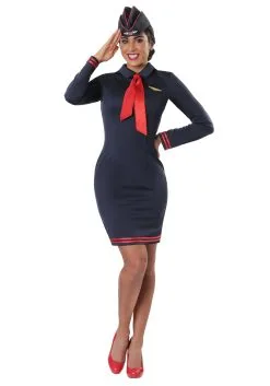 Flight attendants are pure class—think about it, you never see them kick their shoes off on a plane or sport yoga pants and a hoodie! No, they are dressed to impress and ready to make your flight more comfortable. And we love a uniform that includes a timeless hat, like this one. Our design team researched the perfect colors, proportions, and cut to create this exclusive costume that makes you part of the crew, immediately. It includes the navy-blue, long-sleeved, collared sheath dress, and a red neck tie that brings out the brightness of the dress’ red-stripe accents. The cap has coordinated red trim and aviation wings to spruce it up! Add a pair of red heels and polish your pearly whites, because the skies are lookin’ friendly tonight!