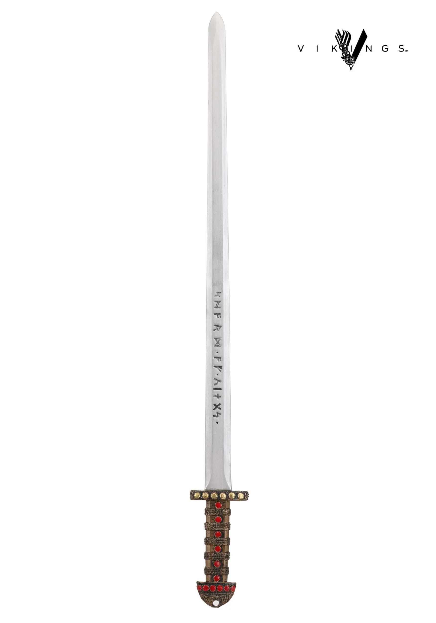 This Vikings Ragnar Lothbrok Toy Sword is inspired by the one wielded by Ragnar in the Vikings series. The toy weapon is made out of molded plastic and comes with a silver blade. The middle of the blade has runes inscribed into it. The handle has red accents and a rounded pommel on the end. Since it is a toy, we don’t recommend charging into battle with it, but it will complete your Ragnar costume as you invade the next costume party!